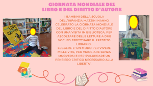 Giovedì 23 Aprile i bambini della Scuola dell’Infanzia Mazzini hanno celebrato la Giornata Mondiale del Libro e del Diritto d’Autore con una visita presso la Biblioteca dei Ragazzi per ascoltare delle letture a due voci ad opera della bibliotecaria Claudia Mosciatti e della lettrice volontaria Patrizia Montalbini, oltre ad effettuare il prestito librario.